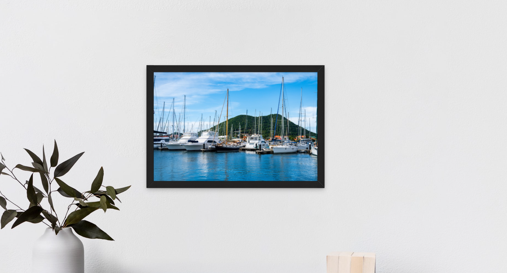 The blues of the Caribbean Sea meet the blues of the sky as the boats sit at anchor awaiting a new voyage. The image pictures the small harbor of Gros Islet in Saint Lucia, a vibrate community offering even more vibrant colors.