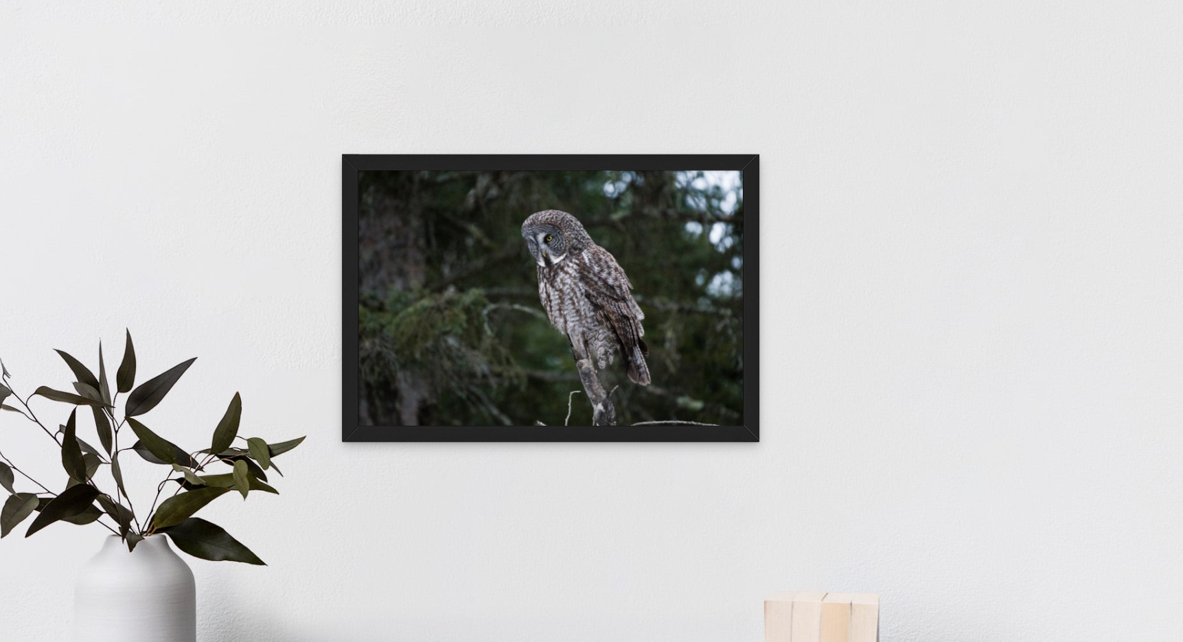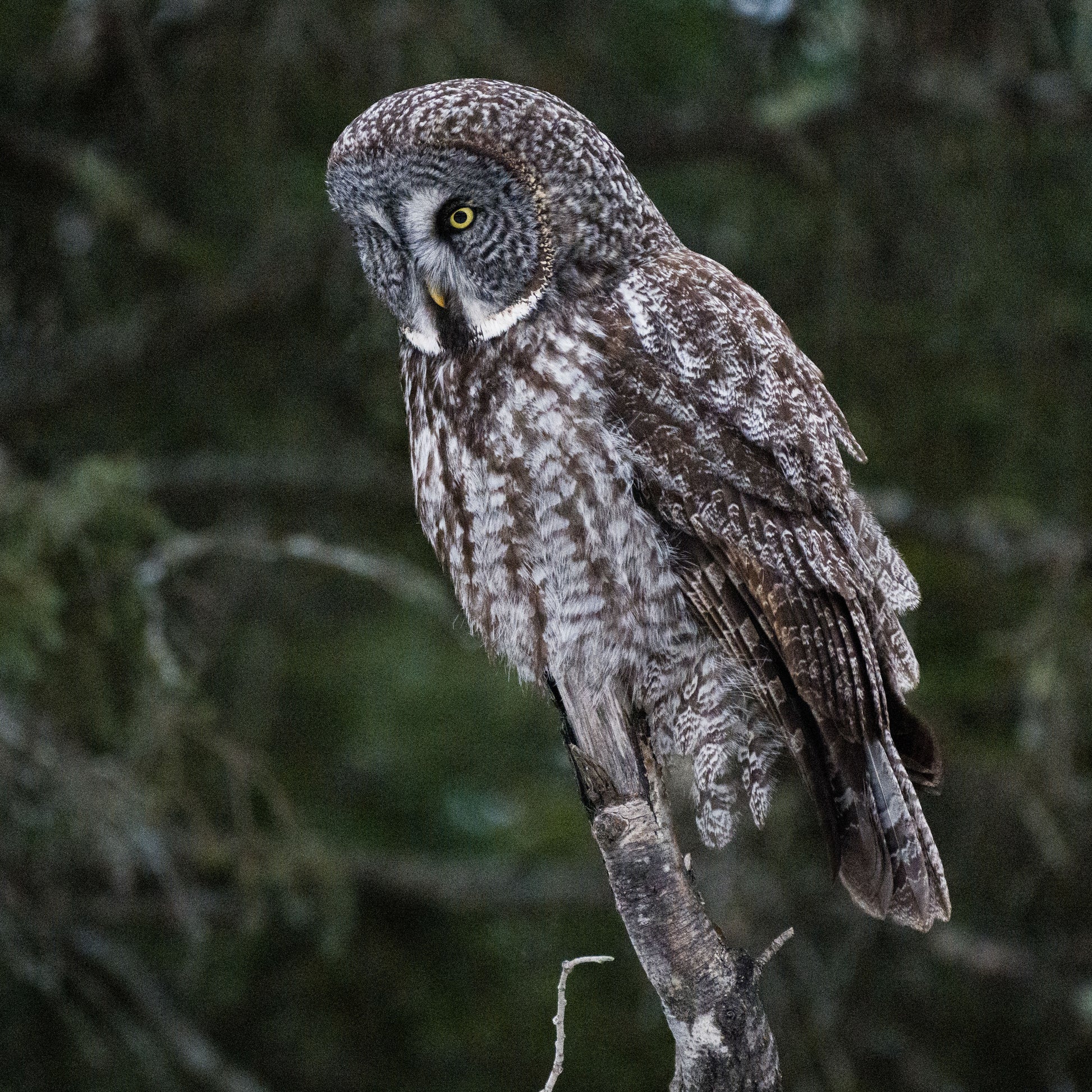 A Great Grey Owl rests on top of a dead tree in Sax-Zim Bog in Northern Minnesota. Just after taking the photo, the Great Grey Owl dove off of its vantage to pierce through the thick snow cover and catch a field mouse.
