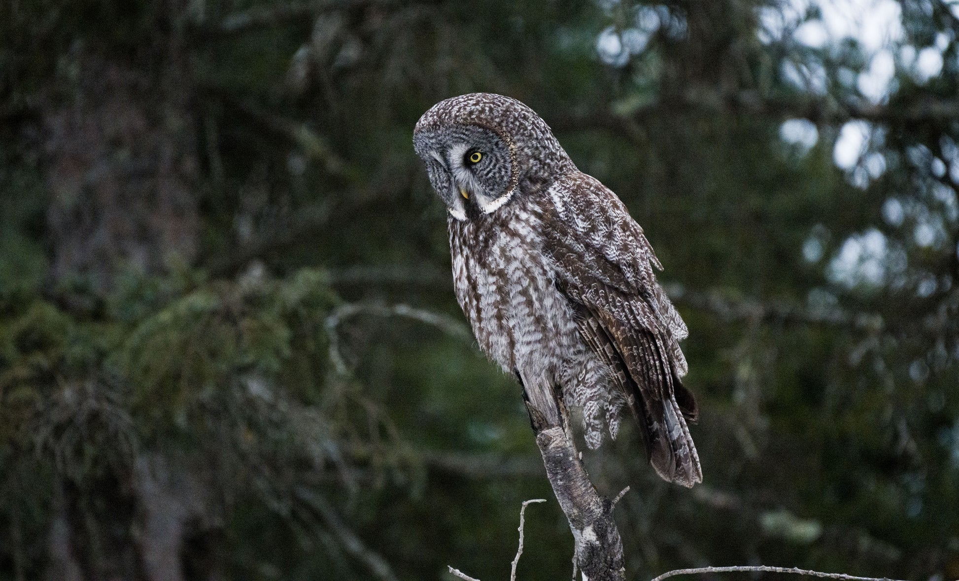 A Great Grey Owl rests on top of a dead tree in Sax-Zim Bog in Northern Minnesota. Just after taking the photo, the Great Grey Owl dove off of its vantage to pierce through the thick snow cover and catch a field mouse.