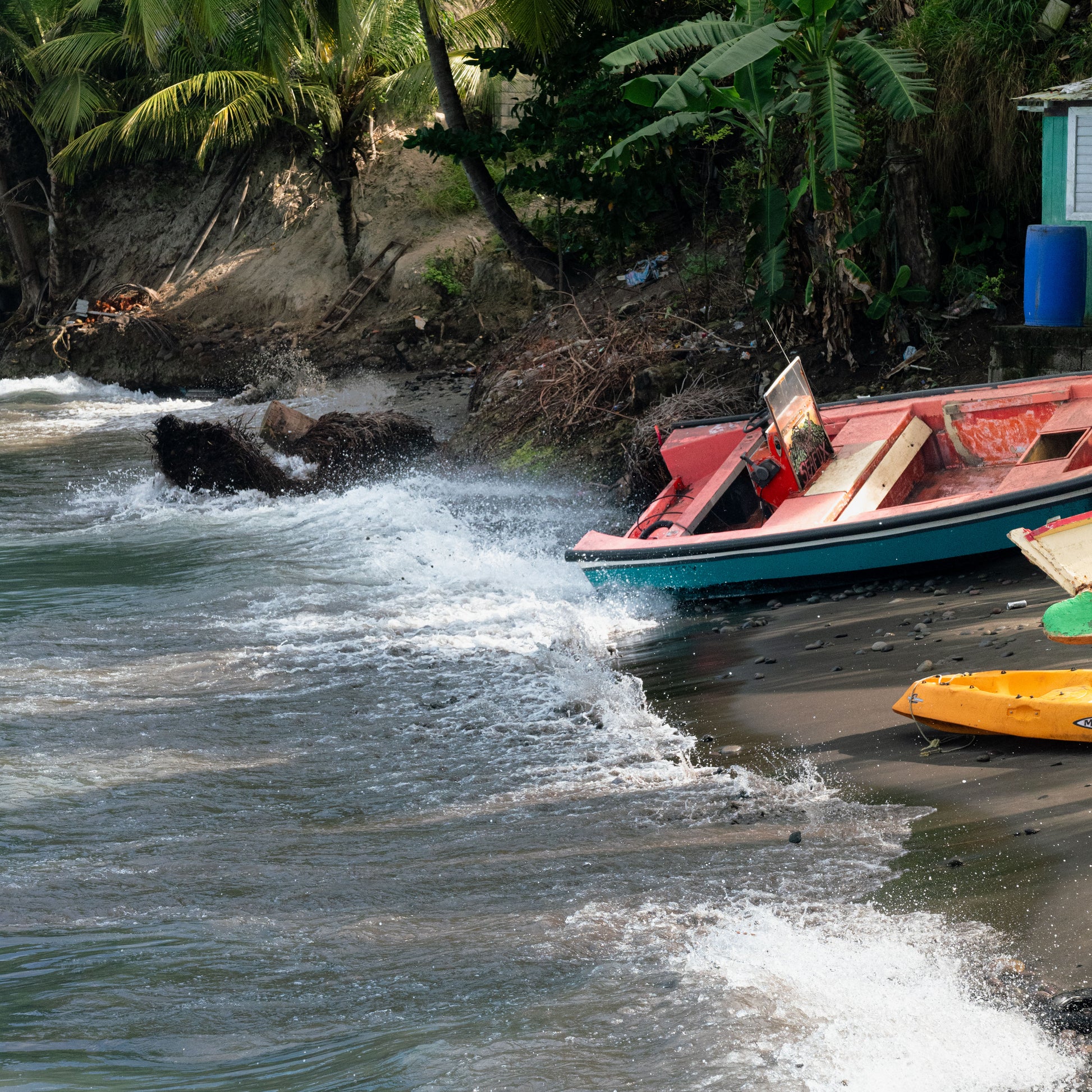 On the shore-swept beaches of Saint Lucia sit vibrant fishing boats waiting for the time to embark once again into the Caribbean Sea. Under the deep greens of the jungle canopy, alongside the rich blue of the pristine sea, the paint of the boats create an eye-catching scene.